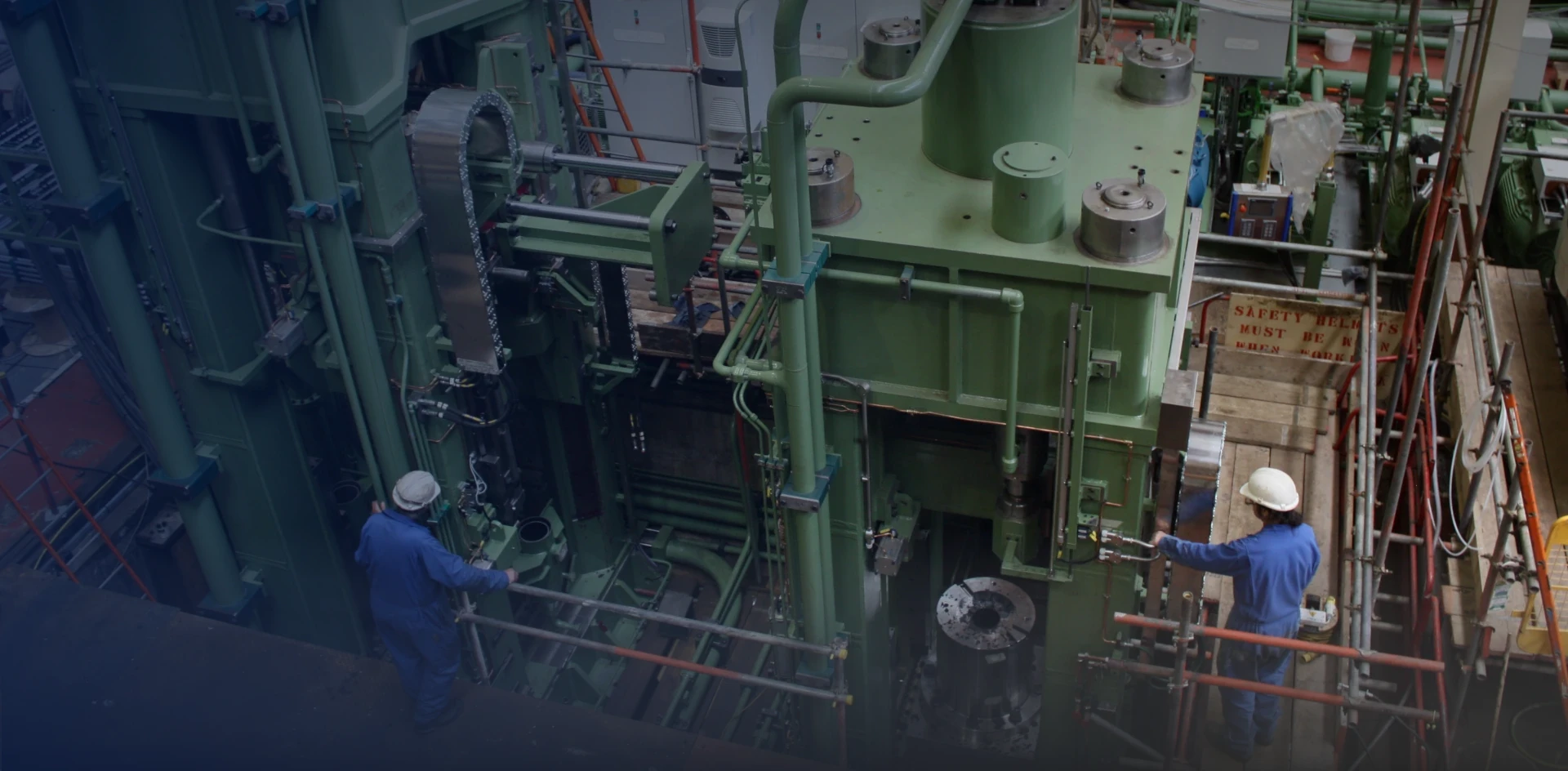 A down-stroke hydraulic upsetting press forms a round billet from a cut bar 200mm x 200mm. The press produces a defined dimensional billet to the correct length and diameter. A down-stroke hydraulic piercing press takes the upset billet and forms a cup-shaped ‘bottle’. Finally, an up-stroking hydraulic draw press takes the pierced billet and ‘draws’ it to its final length and diameter.